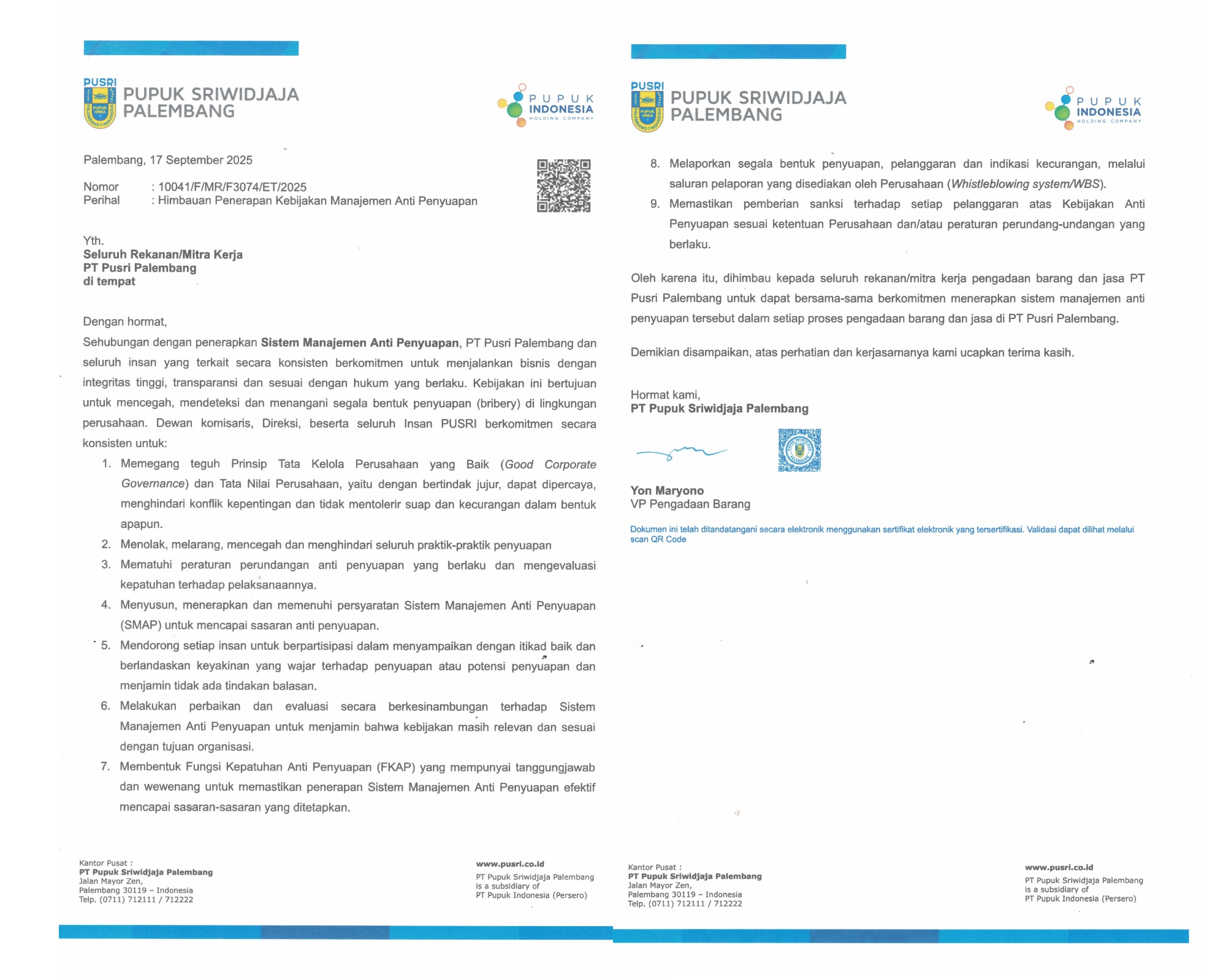 Himbauan Penerapan Sistem Manajemen Anti Penyuapan berbasis ISO 37001 PT Pupuk Sriwidjaja Palembang, dimana link himbauannya sebagai berikut :